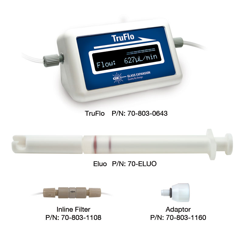 The TruFlo is a precision device for micro flow measurement and has many applications other than monitoring ICP sample flows. It incorporates an accurate flow sensor to facilitate real time measurement of low liquid flow rates. The inert flow path comprises PEEK, borosilicate glass and Teflon, making it suitable for use with most liquids. And the flow rate can be logged by your computer as well as displayed on the inbuilt screen. We can even customize the output to fit your requirements. Please contact Glass Expansion to discuss how the TruFlo can assist with your flow sensing requirements.