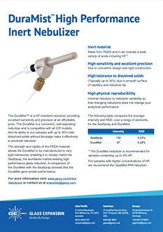 Glass Expansion's DuraMist™ DC Nebulizer is one of our most versatile and durable concentric nebulizer designs. Manufactured with a PEEK body and PTFE capillary insert, the DuraMist can handle the toughest acid matrices, including up to 5% Hydrofluoric Acid (HF). A uniquely designed smooth tip, provides an outstanding tolerance to total dissolved solids (TDS), up to 30%. Manufactured under the most critical specifications, the DuraMist DC delivers superior sensitivity and precision at a cost-effective price.