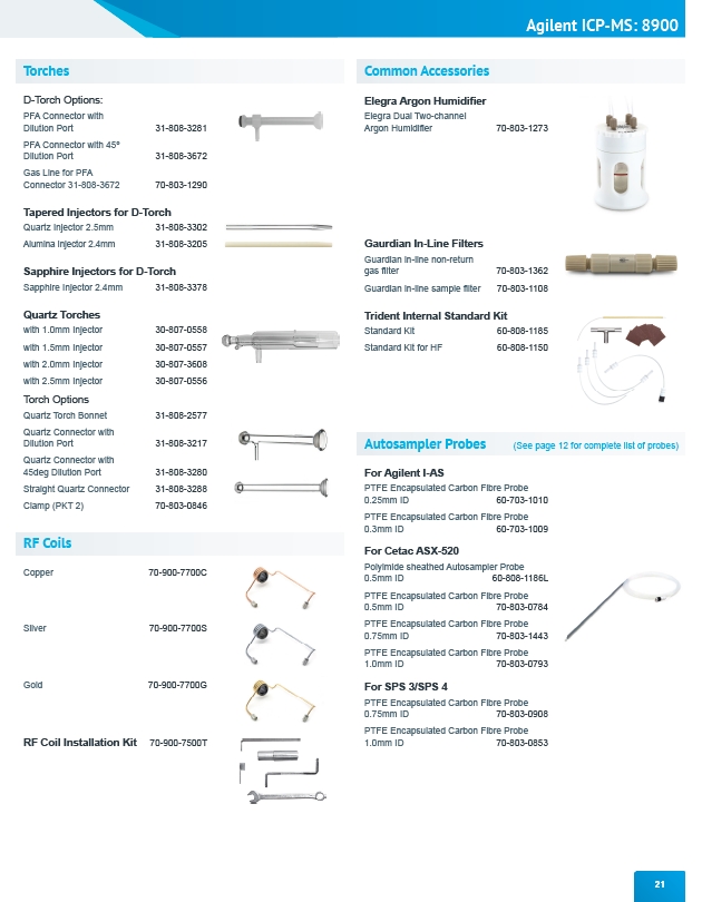 Agilent ICP-MS: 8900 21 Torches D-Torch Options: PFA Connector with Dilution Port 31-808-3281 PFA Connector with 45º Dilution Port 31-808-3672 Gas Line for PFA Connector 31-808-3672 70-803-1290 Tapered Injectors for D-Torch Quartz Injector 2.5mm 31-808-3302 Alumina Injector 2.4mm 31-808-3205 Sapphire Injectors for D-Torch Sapphire Injector 2.4mm 31-808-3378 Quartz Torches with 1.0mm Injector 30-807-0558 with 1.5mm Injector 30-807-0557 with 2.0mm Injector 30-807-3608 with 2.5mm Injector 30-807-0556 Torch Options Quartz Torch Bonnet 31-808-2577 Quartz Connector with Dilution Port 31-808-3217 Quartz Connector with 45deg Dilution Port 31-808-3280 Straight Quartz Connector 31-808-3288 Clamp (PKT 2) 70-803-0846 RF Coils Silver 70-900-7700S Gold 70-900-7700G RF Coil Installation Kit 70-900-7500T Common Accessories Elegra Argon Humidifier Elegra Dual Two-channel Argon Humidifier 70-803-1273 Gaurdian In-Line Filters Guardian in-line non-return gas filter 70-803-1362 Guardian in-line sample filter 70-803-1108 Trident Internal Standard Kit Standard Kit 60-808-1185 Standard Kit for HF 60-808-1150 Copper 70-900-7700C Autosampler Probes (See page 12 for complete list of probes) For Agilent I-AS PTFE Encapsulated Carbon Fibre Probe 0.25mm ID 60-703-1010 PTFE Encapsulated Carbon Fibre Probe 0.3mm ID 60-703-1009 For Cetac ASX-520 Polyimide sheathed Autosampler Probe 0.5mm ID 60-808-1186L PTFE Encapsulated Carbon Fibre Probe 0.5mm ID 70-803-0784 PTFE Encapsulated Carbon Fibre Probe 0.75mm ID 70-803-1443 PTFE Encapsulated Carbon Fibre Probe 1.0mm ID 70-803-0793 For SPS 3/SPS 4 PTFE Encapsulated Carbon Fibre Probe 0.75mm ID 70-803-0908 PTFE Encapsulated Carbon Fibre Probe 1.0mm ID 70-803-0853