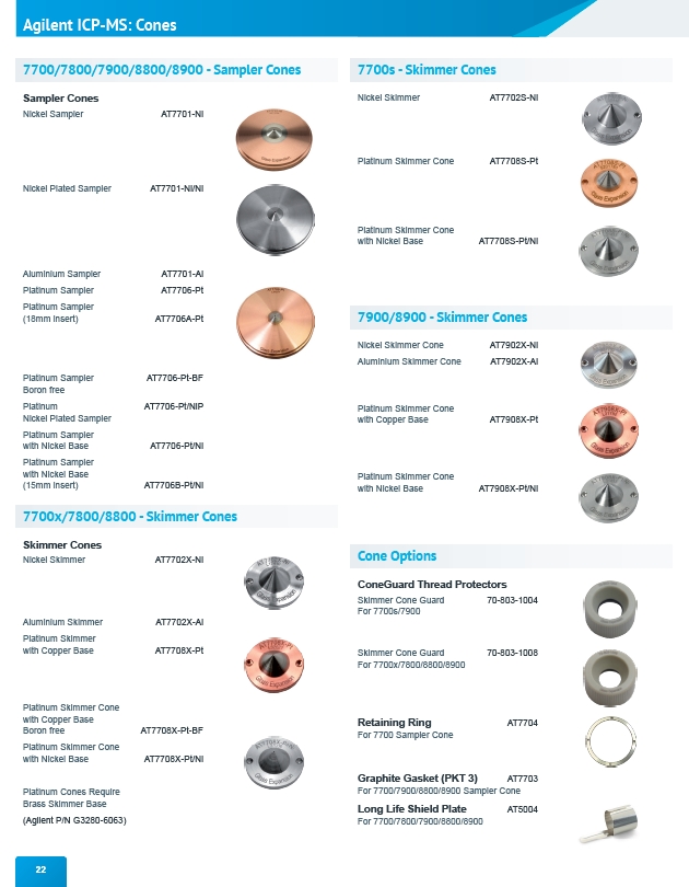 Agilent ICP-MS: Cones 7700/7800/7900/8800/8900 - Sampler Cones Sampler Cones Nickel Sampler AT7701-Ni Nickel Plated Sampler AT7701-Ni/Ni Aluminium Sampler AT7701-Al Platinum Sampler AT7706-Pt Platinum Sampler (18mm insert) AT7706A-Pt Platinum Sampler AT7706-Pt-BF Boron free Platinum AT7706-Pt/NiP Nickel Plated Sampler Platinum Sampler with Nickel Base AT7706-Pt/Ni Platinum Sampler with Nickel Base (15mm insert) AT7706B-Pt/Ni 7700x/7800/8800 - Skimmer Cones Aluminium Skimmer AT7702X-Al Platinum Skimmer with Copper Base AT7708X-Pt 22 Nickel Skimmer AT7702S-Ni Skimmer Cones Nickel Skimmer AT7702X-Ni 7700s - Skimmer Cones Platinum Skimmer Cone AT7708S-Pt Platinum Skimmer Cone with Nickel Base AT7708S-Pt/Ni 7900/8900 - Skimmer Cones Platinum Skimmer Cone with Copper Base Boron free AT7708X-Pt-BF Platinum Skimmer Cone with Nickel Base AT7708X-Pt/Ni Platinum Cones Require Brass Skimmer Base (Agilent P/N G3280-6063) Nickel Skimmer Cone AT7902X-Ni Aluminium Skimmer Cone AT7902X-Al Platinum Skimmer Cone with Copper Base AT7908X-Pt Platinum Skimmer Cone with Nickel Base AT7908X-Pt/Ni Cone Options ConeGuard Thread Protectors Skimmer Cone Guard 70-803-1004 For 7700s/7900 Skimmer Cone Guard 70-803-1008 For 7700x/7800/8800/8900 Retaining Ring AT7704 For 7700 Sampler Cone Graphite Gasket (PKT 3) AT7703 For 7700/7900/8800/8900 Sampler Cone Long Life Shield Plate AT5004 For 7700/7800/7900/8800/8900