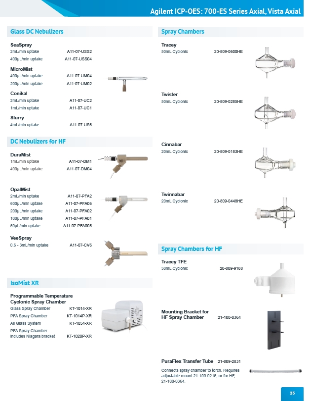 Agilent ICP-OES: 700-ES Series Axial, Vista Axial 25 Glass DC Nebulizers SeaSpray 2mL/min uptake A11-07-USS2 400μL/min uptake A11-07-USS04 MicroMist 400μL/min uptake A11-07-UM04 200μL/min uptake A11-07-UM02 Conikal 2mL/min uptake A11-07-UC2 1mL/min uptake A11-07-UC1 Slurry 4mL/min uptake A11-07-US6 DC Nebulizers for HF DuraMist 1mL/min uptake A11-07-DM1 400μL/min uptake A11-07-DM04 OpalMist 2mL/min uptake A11-07-PFA2 600μL/min uptake A11-07-PFA06 200μL/min uptake A11-07-PFA02 100μL/min uptake A11-07-PFA01 50μL/min uptake A11-07-PFA005 IsoMist XR Programmable Temperature Cyclonic Spray Chamber Glass Spray Chamber KT-1014-XR PFA Spray Chamber KT-1014P-XR All Glass System KT-1054-XR PFA Spray Chamber includes Niagara bracket KT-1020P-XR Spray Chambers Tracey 50mL Cyclonic 20-809-0600HE Twister 50mL Cyclonic 20-809-0285HE Cinnabar 20mL Cyclonic 20-809-0183HE Twinnabar 20mL Cyclonic 20-809-0448HE Spray Chambers for HF Tracey TFE 50mL Cyclonic 20-809-9188 Mounting Bracket for HF Spray Chamber 21-100-0364 PuraFlex Transfer Tube 21-809-2831 Connects spray chamber to torch. Requires adjustable mount 21-100-0215, or for HF, 21-100-0364. VeeSpray 0.6 - 3mL/min uptake A11-07-CV6