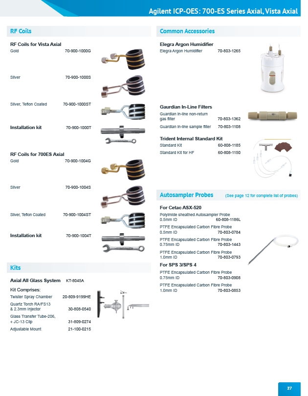 Agilent ICP-OES: 700-ES Series Axial, Vista Axial 27 RF Coils RF Coils for Vista Axial Gold 70-900-1000G Silver 70-900-1000S Silver, Teflon Coated 70-900-1000ST Installation kit 70-900-1000T RF Coils for 700ES Axial Gold 70-900-1004G Silver 70-900-1004S Silver, Teflon Coated 70-900-1004ST Installation kit 70-900-1004T Kits Axial All Glass System KT-8045A Kit Comprises: Twister Spray Chamber 20-809-9199HE Quartz Torch RA/FS13 & 2.3mm Injector 30-808-0540 Glass Transfer Tube-206, + JC-13 Clip 31-809-0274 Adjustable Mount 21-100-0215 Common Accessories Elegra Argon Humidifier Elegra Argon Humidifier 70-803-1265 Gaurdian In-Line Filters Guardian in-line non-return gas filter 70-803-1362 Guardian in-line sample filter 70-803-1108 Trident Internal Standard Kit Standard Kit 60-808-1185 Standard Kit for HF 60-808-1150 Autosampler Probes For Cetac ASX-520 Polyimide sheathed Autosampler Probe 0.5mm ID 60-808-1186L PTFE Encapsulated Carbon Fibre Probe 0.5mm ID 70-803-0784 PTFE Encapsulated Carbon Fibre Probe 0.75mm ID 70-803-1443 PTFE Encapsulated Carbon Fibre Probe 1.0mm ID 70-803-0793 For SPS 3/SPS 4 PTFE Encapsulated Carbon Fibre Probe 0.75mm ID 70-803-0908 PTFE Encapsulated Carbon Fibre Probe 1.0mm ID 70-803-0853 (See page 12 for complete list of probes)