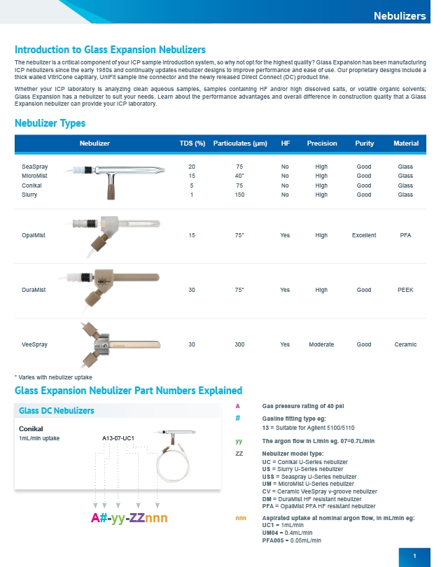 ICP nebulizers since the early 1980s and continually updates nebulizer designs to improve performance and ease of use. Our proprietary designs include a