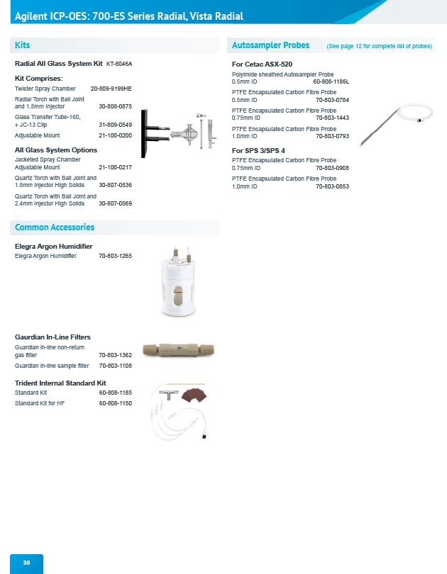 Agilent ICP-OES: 700-ES Series Radial, Vista Radial Kits Radial All Glass System Kit KT-8046A Kit Comprises: Twister Spray Chamber 20-809-9199HE Radial Torch with Ball Joint and 1.5mm Injector 30-808-0875 Glass Transfer Tube-160, + JC-13 Clip 31-809-0549 Adjustable Mount 21-100-0200 All Glass System Options Jacketed Spray Chamber Adjustable Mount 21-100-0217 Quartz Torch with Ball Joint and 1.8mm Injector High Solids 30-807-0536 Quartz Torch with Ball Joint and 2.4mm Injector High Solids 30-807-0569 Common Accessories Elegra Argon Humidifier Elegra Argon Humidifier 70-803-1265 Gaurdian In-Line Filters Guardian in-line non-return gas filter 70-803-1362 Guardian in-line sample filter 70-803-1108 Trident Internal Standard Kit Standard Kit 60-808-1185 Standard Kit for HF 60-808-1150 30 Autosampler Probes For Cetac ASX-520 Polyimide sheathed Autosampler Probe 0.5mm ID 60-808-1186L PTFE Encapsulated Carbon Fibre Probe 0.5mm ID 70-803-0784 PTFE Encapsulated Carbon Fibre Probe 0.75mm ID 70-803-1443 PTFE Encapsulated Carbon Fibre Probe 1.0mm ID 70-803-0793 For SPS 3/SPS 4 PTFE Encapsulated Carbon Fibre Probe 0.75mm ID 70-803-0908 PTFE Encapsulated Carbon Fibre Probe 1.0mm ID 70-803-0853 (See page 12 for complete list of probes)