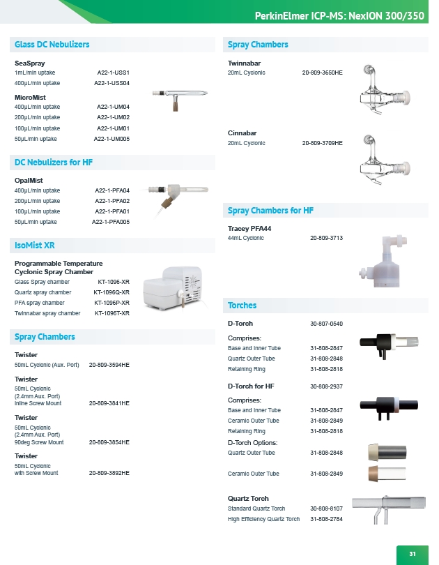 PerkinElmer ICP-MS: NexION 300/350 31 Glass DC Nebulizers SeaSpray 1mL/min uptake A22-1-USS1 400μL/min uptake A22-1-USS04 MicroMist 400μL/min uptake A22-1-UM04 200μL/min uptake A22-1-UM02 100μL/min uptake A22-1-UM01 50μL/min uptake A22-1-UM005 DC Nebulizers for HF OpalMist 400μL/min uptake A22-1-PFA04 200μL/min uptake A22-1-PFA02 100μL/min uptake A22-1-PFA01 50μL/min uptake A22-1-PFA005 Twinnabar 20mL Cyclonic 20-809-3650HE Cinnabar 20mL Cyclonic 20-809-3709HE D-Torch 30-807-0540 Comprises: Base and Inner Tube 31-808-2847 Quartz Outer Tube 31-808-2848 Retaining Ring 31-808-2818 D-Torch for HF 30-808-2937 Comprises: Base and Inner Tube 31-808-2847 Ceramic Outer Tube 31-808-2849 Retaining Ring 31-808-2818 D-Torch Options: Quartz Outer Tube 31-808-2848 Ceramic Outer Tube 31-808-2849 Quartz Torch Standard Quartz Torch 30-808-8107 High Efficiency Quartz Torch 31-808-2784 IsoMist XR Twister 50mL Cyclonic (Aux. Port) 20-809-3594HE Twister 50mL Cyclonic (2.4mm Aux. Port) Inline Screw Mount 20-809-3841HE Twister 50mL Cyclonic (2.4mm Aux. Port) 90deg Screw Mount 20-809-3854HE Twister 50mL Cyclonic with Screw Mount 20-809-3892HE Tracey PFA44 44mL Cyclonic 20-809-3713 Spray Chambers Spray Chambers Spray Chambers for HF Torches Programmable Temperature Cyclonic Spray Chamber Glass Spray chamber KT-1096-XR Quartz spray chamber KT-1096Q-XR PFA spray chamber KT-1096P-XR Twinnabar spray chamber KT-1096T-XR