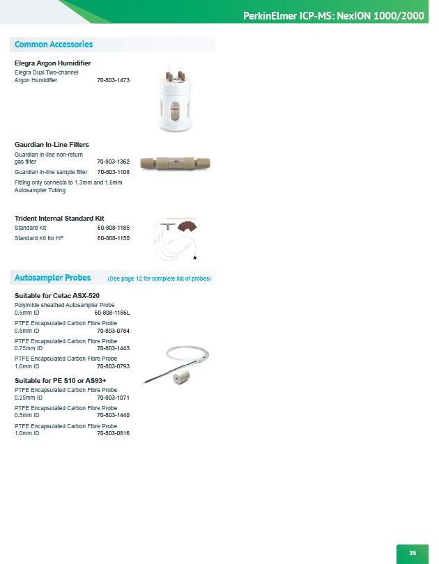 PerkinElmer ICP-MS: NexION 1000/2000 35 Common Accessories Elegra Argon Humidifier Elegra Dual Two-channel Argon Humidifier 70-803-1473 Gaurdian In-Line Filters Guardian in-line non-return gas filter 70-803-1362 Guardian in-line sample filter 70-803-1108 Fitting only connects to 1.3mm and 1.6mm Autosampler Tubing Trident Internal Standard Kit Standard Kit 60-808-1185 Standard Kit for HF 60-808-1150 Autosampler Probes (See page 12 for complete list of probes) Suitable for Cetac ASX-520 Polyimide sheathed Autosampler Probe 0.5mm ID 60-808-1186L PTFE Encapsulated Carbon Fibre Probe 0.5mm ID 70-803-0784 PTFE Encapsulated Carbon Fibre Probe 0.75mm ID 70-803-1443 PTFE Encapsulated Carbon Fibre Probe 1.0mm ID 70-803-0793 Suitable for PE S10 or AS93+ PTFE Encapsulated Carbon Fibre Probe 0.25mm ID 70-803-1071 PTFE Encapsulated Carbon Fibre Probe 0.5mm ID 70-803-1440 PTFE Encapsulated Carbon Fibre Probe 1.0mm ID 70-803-0816
