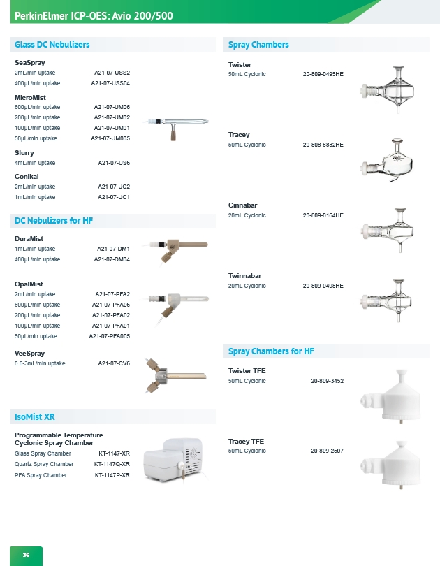 PerkinElmer ICP-OES: Avio 200/500 Glass DC Nebulizers DC Nebulizers for HF DuraMist 1mL/min uptake A21-07-DM1 400μL/min uptake A21-07-DM04 OpalMist 2mL/min uptake A21-07-PFA2 600μL/min uptake A21-07-PFA06 200μL/min uptake A21-07-PFA02 100μL/min uptake A21-07-PFA01 50μL/min uptake A21-07-PFA005 VeeSpray 0.6-3mL/min uptake A21-07-CV6 IsoMist XR Programmable Temperature Cyclonic Spray Chamber Glass Spray Chamber KT-1147-XR Quartz Spray Chamber KT-1147Q-XR PFA Spray Chamber KT-1147P-XR 36 Spray Chambers Twister 50mL Cyclonic 20-809-0495HE Tracey 50mL Cyclonic 20-808-8882HE Cinnabar 20mL Cyclonic 20-809-0164HE Twinnabar 20mL Cyclonic 20-809-0498HE Spray Chambers for HF Twister TFE 50mL Cyclonic 20-809-3452 Tracey TFE 50mL Cyclonic 20-809-2507 SeaSpray 2mL/min uptake A21-07-USS2 400μL/min uptake A21-07-USS04 MicroMist 600μL/min uptake A21-07-UM06 200μL/min uptake A21-07-UM02 100μL/min uptake A21-07-UM01 50μL/min uptake A21-07-UM005 Slurry 4mL/min uptake A21-07-US6 Conikal 2mL/min uptake A21-07-UC2 1mL/min uptake A21-07-UC1