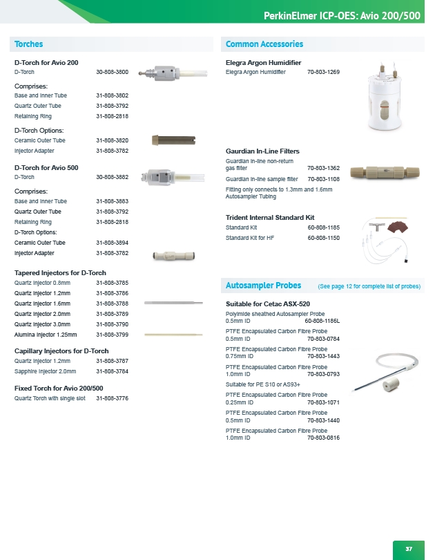 PerkinElmer ICP-OES: Avio 200/500 37 Torches Common Accessories D-Torch for Avio 200 D-Torch 30-808-3800 Comprises: Base and Inner Tube 31-808-3802 Quartz Outer Tube 31-808-3792 Retaining Ring 31-808-2818 D-Torch Options: Ceramic Outer Tube 31-808-3820 Injector Adapter 31-808-3782 D-Torch for Avio 500 D-Torch 30-808-3882 Comprises: Base and Inner Tube 31-808-3883 Quartz Outer Tube 31-808-3792 Retaining Ring 31-808-2818 D-Torch Options: Ceramic Outer Tube 31-808-3894 Injector Adapter 31-808-3782 Elegra Argon Humidifier Elegra Argon Humidifier 70-803-1269 Gaurdian In-Line Filters Guardian in-line non-return gas filter 70-803-1362 Guardian in-line sample filter 70-803-1108 Fitting only connects to 1.3mm and 1.6mm Autosampler Tubing Trident Internal Standard Kit Standard Kit 60-808-1185 Standard Kit for HF 60-808-1150 Tapered Injectors for D-Torch Quartz Injector 0.8mm 31-808-3785 Quartz Injector 1.2mm 31-808-3786 Quartz Injector 1.6mm 31-808-3788 Quartz Injector 2.0mm 31-808-3789 Quartz Injector 3.0mm 31-808-3790 Alumina Injector 1.25mm 31-808-3799 Capillary Injectors for D-Torch Quartz Injector 1.2mm 31-808-3787 Sapphire Injector 2.0mm 31-808-3784 Fixed Torch for Avio 200/500 Quartz Torch with single slot 31-808-3776 Autosampler Probes Suitable for Cetac ASX-520 Polyimide sheathed Autosampler Probe 0.5mm ID 60-808-1186L PTFE Encapsulated Carbon Fibre Probe 0.5mm ID 70-803-0784 PTFE Encapsulated Carbon Fibre Probe 0.75mm ID 70-803-1443 PTFE Encapsulated Carbon Fibre Probe 1.0mm ID 70-803-0793 Suitable for PE S10 or AS93+ PTFE Encapsulated Carbon Fibre Probe 0.25mm ID 70-803-1071 PTFE Encapsulated Carbon Fibre Probe 0.5mm ID 70-803-1440 PTFE Encapsulated Carbon Fibre Probe 1.0mm ID 70-803-0816 (See page 12 for complete list of probes)