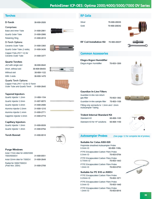 PerkinElmer ICP-OES: Optima 2000/4000/5000/7000 DV Series 39 Torches D-Torch 30-808-2926 Comprises: Base and Inner Tube 31-808-2981 Quartz Outer Tube 31-808-2986 Retaining Ring 31-808-2818 D-Torch Options: Ceramic Outer Tube 31-808-3365 Quartz Outer Tube (3 slots) 31-808-3436 Copper Foils (PKT 12) for Ceramic Outer Tube 31-808-3377 Quartz Torches JAZ with single slot 30-808-0845 Short, without slot 30-808-0845S Without slot 30-808-1122 With 3 slots 30-808-1470 Quartz Torch Options: Copper Foils (PKT 12) for D-Torch Outer Tube and Quartz Torch 31-808-2645 Torch Bonnet 31-800-0018 RF Coils Common Accessories Tapered Injectors Quartz Injector 1.2mm 31-808-1154 Quartz Injector 2.0mm 31-807-0075 Quartz Injector 3.0mm 31-808-2506 Alumina Injector 2.0mm 31-808-1210 Alumina Injector 2.4mm 31-808-2771 Sapphire Injector 2.0mm 31-808-2774 Capillary Injectors Quartz Injector 1.0mm 31-808-0939 Quartz Injector 1.8mm 31-808-0794 Purge Windows Axial 17mm disk for 4000/5000 7000/8000DV 31-808-0551 Axial 32mm disk for 7000DV 31-808-2649 Radial for 5000/7000DV (Post Nov. 2004) 31-808-2788 Silver 70-900-2003S Gold 70-900-2003G RF Coil Installation Kit 70-900-2003T Elegra Argon Humidifier Elegra Argon Humidifier 70-803-1269 Gaurdian In-Line Filters Guardian in-line non-return gas filter 70-803-1362 Guardian in-line sample filter 70-803-1108 Fitting only connects to 1.3mm and 1.6mm Autosampler Tubing Trident Internal Standard Kit Standard Kit 60-808-1185 Standard Kit for HF solutions 60-808-1150 Autosampler Probes (See page 12 for complete list of probes) Suitable for Cetac ASX-520 Polyimide sheathed Autosampler Probe 0.5mm ID 60-808-1186L PTFE Encapsulated Carbon Fibre Probe 0.5mm ID 70-803-0784 PTFE Encapsulated Carbon Fibre Probe 0.75mm ID 70-803-1443 PTFE Encapsulated Carbon Fibre Probe 1.0mm ID 70-803-0793 Suitable for PE S10 or AS93+ PTFE Encapsulated Carbon Fibre Probe 0.25mm ID 70-803-1071 PTFE Encapsulated Carbon Fibre Probe 0.5mm ID 70-803-1440 PTFE Encapsulated Carbon Fibre Probe 1.0mm ID 70-803-0816