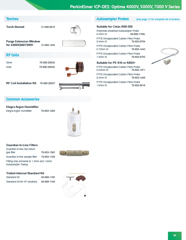 PerkinElmer ICP-OES: Optima 4000V, 5000V, 7000 V Series 41 Torches Torch Bonnet 31-800-0018 RF Coils Silver 70-900-2003S Gold 70-900-2003G RF Coil Installation Kit 70-900-2003T Common Accessories Elegra Argon Humidifier Elegra Argon Humidifier 70-803-1269 Gaurdian In-Line Filters Guardian in-line non-return gas filter 70-803-1362 Guardian in-line sample filter 70-803-1108 Fitting only connects to 1.3mm and 1.6mm Autosampler Tubing Autosampler Probes (See page 12 for complete list of probes) Suitable for Cetac ASX-520 Polyimide sheathed Autosampler Probe 0.5mm ID 60-808-1186L PTFE Encapsulated Carbon Fibre Probe 0.5mm ID 70-803-0784 PTFE Encapsulated Carbon Fibre Probe 0.75mm ID 70-803-1443 PTFE Encapsulated Carbon Fibre Probe 1.0mm ID 70-803-0793 Suitable for PE S10 or AS93+ PTFE Encapsulated Carbon Fibre Probe 0.25mm ID 70-803-1071 PTFE Encapsulated Carbon Fibre Probe 0.5mm ID 70-803-1440 PTFE Encapsulated Carbon Fibre Probe 1.0mm ID 70-803-0816 Purge Extension Window for 4300/5300/7300V 31-808-1345 Trident Internal Standard Kit Standard Kit 60-808-1185 Standard Kit for HF solutions 60-808-1150