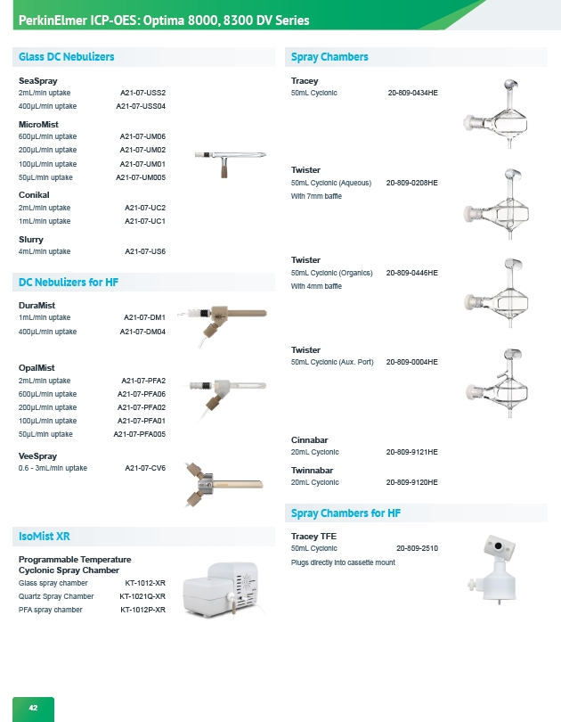 PerkinElmer ICP-OES: Optima 8000, 8300 DV Series Glass DC Nebulizers SeaSpray 2mL/min uptake A21-07-USS2 400μL/min uptake A21-07-USS04 MicroMist 600μL/min uptake A21-07-UM06 200μL/min uptake A21-07-UM02 100μL/min uptake A21-07-UM01 50μL/min uptake A21-07-UM005 Conikal 2mL/min uptake A21-07-UC2 1mL/min uptake A21-07-UC1 Slurry 4mL/min uptake A21-07-US6 DC Nebulizers for HF DuraMist 1mL/min uptake A21-07-DM1 400μL/min uptake A21-07-DM04 OpalMist 2mL/min uptake A21-07-PFA2 600μL/min uptake A21-07-PFA06 200μL/min uptake A21-07-PFA02 100μL/min uptake A21-07-PFA01 50μL/min uptake A21-07-PFA005 VeeSpray 0.6 - 3mL/min uptake A21-07-CV6 IsoMist XR Programmable Temperature Cyclonic Spray Chamber Glass spray chamber KT-1012-XR Quartz Spray Chamber KT-1021Q-XR PFA spray chamber KT-1012P-XR 42 Spray Chambers Tracey 50mL Cyclonic 20-809-0434HE Twister 50mL Cyclonic (Aqueous) 20-809-0208HE With 7mm baffle Twister 50mL Cyclonic (Organics) 20-809-0446HE With 4mm baffle Twister 50mL Cyclonic (Aux. Port) 20-809-0004HE Cinnabar 20mL Cyclonic 20-809-9121HE Twinnabar 20mL Cyclonic 20-809-9120HE Spray Chambers for HF Tracey TFE 50mL Cyclonic 20-809-2510 Plugs directly into cassette mount
