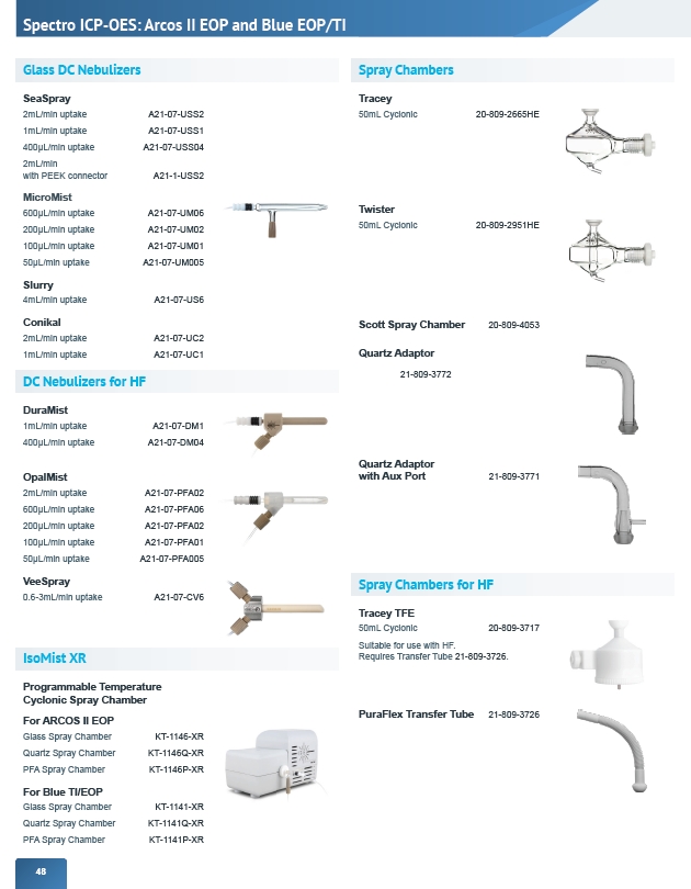 Spectro ICP-OES: Arcos II EOP and Blue EOP/TI Glass DC Nebulizers SeaSpray 2mL/min uptake A21-07-USS2 1mL/min uptake A21-07-USS1 400μL/min uptake A21-07-USS04 2mL/min with PEEK connector A21-1-USS2 MicroMist 600μL/min uptake A21-07-UM06 200μL/min uptake A21-07-UM02 100μL/min uptake A21-07-UM01 50μL/min uptake A21-07-UM005 Slurry 4mL/min uptake A21-07-US6 Conikal 2mL/min uptake A21-07-UC2 1mL/min uptake A21-07-UC1 DC Nebulizers for HF IsoMist XR 48 Spray Chambers Tracey 50mL Cyclonic 20-809-2665HE Twister 50mL Cyclonic 20-809-2951HE Scott Spray Chamber 20-809-4053 Quartz Adaptor 21-809-3772 Quartz Adaptor with Aux Port 21-809-3771 PuraFlex Transfer Tube 21-809-3726 DuraMist 1mL/min uptake A21-07-DM1 400μL/min uptake A21-07-DM04 VeeSpray 0.6-3mL/min uptake A21-07-CV6 Programmable Temperature Cyclonic Spray Chamber For ARCOS II EOP Glass Spray Chamber KT-1146-XR Quartz Spray Chamber KT-1146Q-XR PFA Spray Chamber KT-1146P-XR For Blue TI/EOP Glass Spray Chamber KT-1141-XR Quartz Spray Chamber KT-1141Q-XR PFA Spray Chamber KT-1141P-XR Spray Chambers for HF Tracey TFE 50mL Cyclonic 20-809-3717 Suitable for use with HF. Requires Transfer Tube 21-809-3726. OpalMist 2mL/min uptake A21-07-PFA02 600μL/min uptake A21-07-PFA06 200μL/min uptake A21-07-PFA02 100μL/min uptake A21-07-PFA01 50μL/min uptake A21-07-PFA005