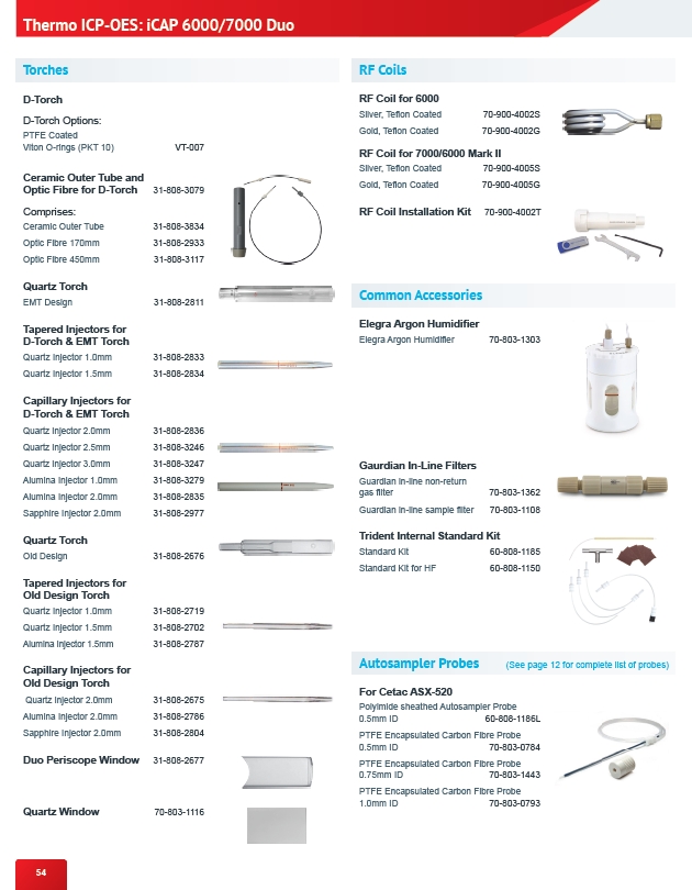 Thermo ICP-OES: iCAP 6000/7000 Duo Ceramic Outer Tube and Optic Fibre for D-Torch 31-808-3079 Comprises: Ceramic Outer Tube 31-808-3834 Optic Fibre 170mm 31-808-2933 Optic Fibre 450mm 31-808-3117 Quartz Torch EMT Design 31-808-2811 Tapered Injectors for D-Torch & EMT Torch Quartz Injector 1.0mm 31-808-2833 Quartz Injector 1.5mm 31-808-2834 Capillary Injectors for D-Torch & EMT Torch Quartz Injector 2.0mm 31-808-2836 Quartz Injector 2.5mm 31-808-3246 Quartz Injector 3.0mm 31-808-3247 Alumina Injector 1.0mm 31-808-3279 Alumina Injector 2.0mm 31-808-2835 Sapphire Injector 2.0mm 31-808-2977 Quartz Torch Old Design 31-808-2676 Tapered Injectors for Old Design Torch Quartz Injector 1.0mm 31-808-2719 Quartz Injector 1.5mm 31-808-2702 Alumina Injector 1.5mm 31-808-2787 Capillary Injectors for Old Design Torch Quartz Injector 2.0mm 31-808-2675 Alumina Injector 2.0mm 31-808-2786 Sapphire Injector 2.0mm 31-808-2804 Duo Periscope Window 31-808-2677 Quartz Window 70-803-1116 54 RF Coils RF Coil for 6000 Silver, Teflon Coated 70-900-4002S Gold, Teflon Coated 70-900-4002G RF Coil for 7000/6000 Mark II Silver, Teflon Coated 70-900-4005S Gold, Teflon Coated 70-900-4005G RF Coil Installation Kit 70-900-4002T Common Accessories Elegra Argon Humidifier Elegra Argon Humidifier 70-803-1303 Gaurdian In-Line Filters Guardian in-line non-return gas filter 70-803-1362 Guardian in-line sample filter 70-803-1108 Trident Internal Standard Kit Standard Kit 60-808-1185 Standard Kit for HF 60-808-1150 Torches Autosampler Probes (See page 12 for complete list of probes) For Cetac ASX-520 Polyimide sheathed Autosampler Probe 0.5mm ID 60-808-1186L PTFE Encapsulated Carbon Fibre Probe 0.5mm ID 70-803-0784 PTFE Encapsulated Carbon Fibre Probe 0.75mm ID 70-803-1443 PTFE Encapsulated Carbon Fibre Probe 1.0mm ID 70-803-0793 D-Torch D-Torch Options: PTFE Coated Viton O-rings (PKT 10) VT-007