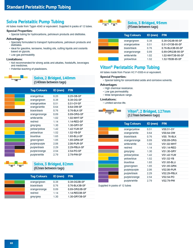 All tubes made from Tygon 4040 or equivalent. Supplied in packs of 12 tubes.