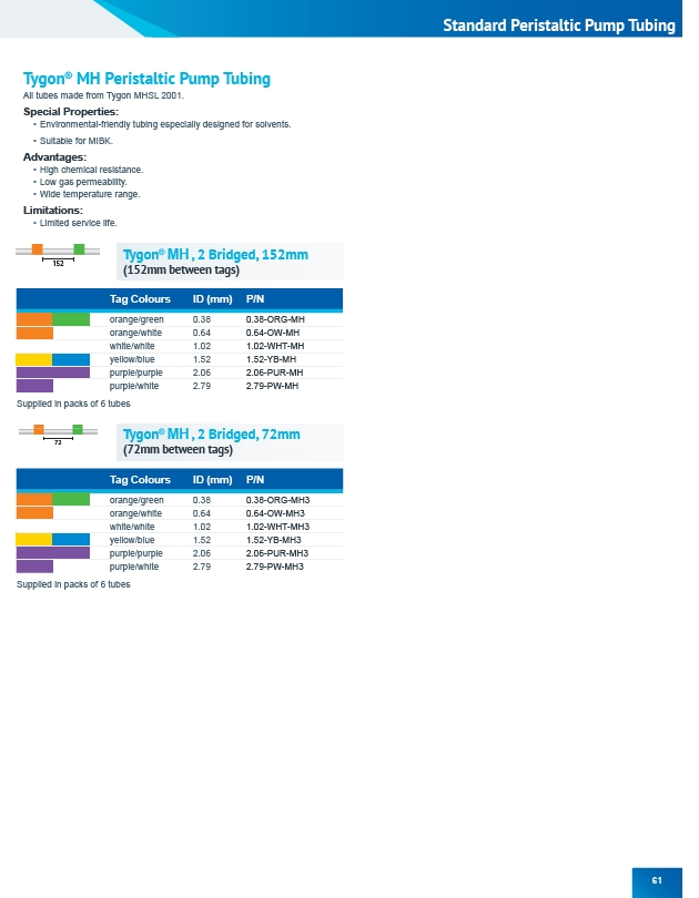 Standard Peristaltic Pump Tubing 61 Tygon® MH Peristaltic Pump Tubing All tubes made from Tygon MHSL 2001. Special Properties: • Environmental-friendly tubing especially designed for solvents. • Suitable for MIBK. Advantages: • High chemical resistance. • Low gas permeability. • Wide temperature range. Limitations: • Limited service life. 152 Tygon® MH , 2 Bridged, 152mm (152mm between tags) Tag Colours ID (mm) P/N orange/green 0.38 0.38-ORG-MH orange/white 0.64 0.64-OW-MH white/white 1.02 1.02-WHT-MH yellow/blue 1.52 1.52-YB-MH purple/purple 2.06 2.06-PUR-MH purple/white 2.79 2.79-PW-MH Supplied in packs of 6 tubes 72 Tygon® MH , 2 Bridged, 72mm (72mm between tags) Tag Colours ID (mm) P/N orange/green 0.38 0.38-ORG-MH3 orange/white 0.64 0.64-OW-MH3 white/white 1.02 1.02-WHT-MH3 yellow/blue 1.52 1.52-YB-MH3 purple/purple 2.06 2.06-PUR-MH3 purple/white 2.79 2.79-PW-MH3 Supplied in packs of 6 tubes